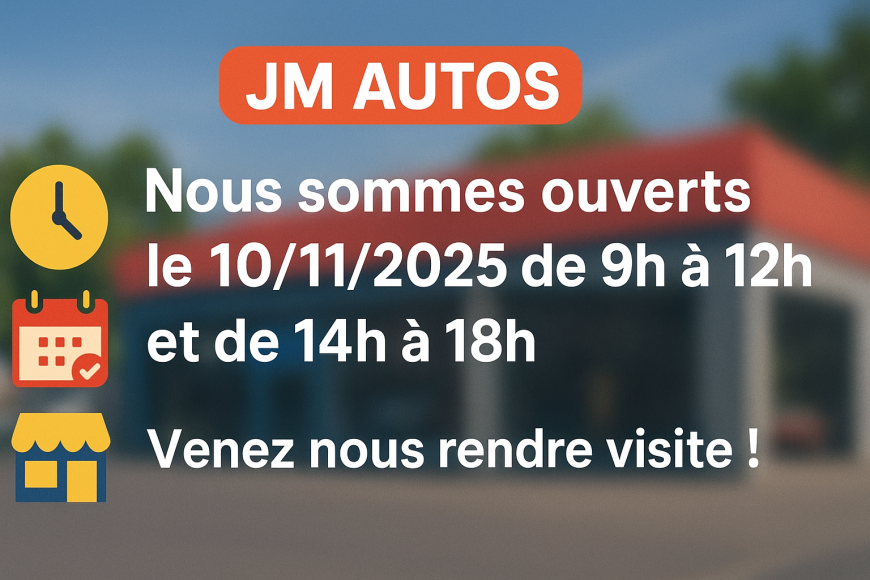 Nous informons notre aimable clientèle que JM AUTOS sera ouvert le lundi 10 novembre 2025, afin de répondre à toutes vos demandes.